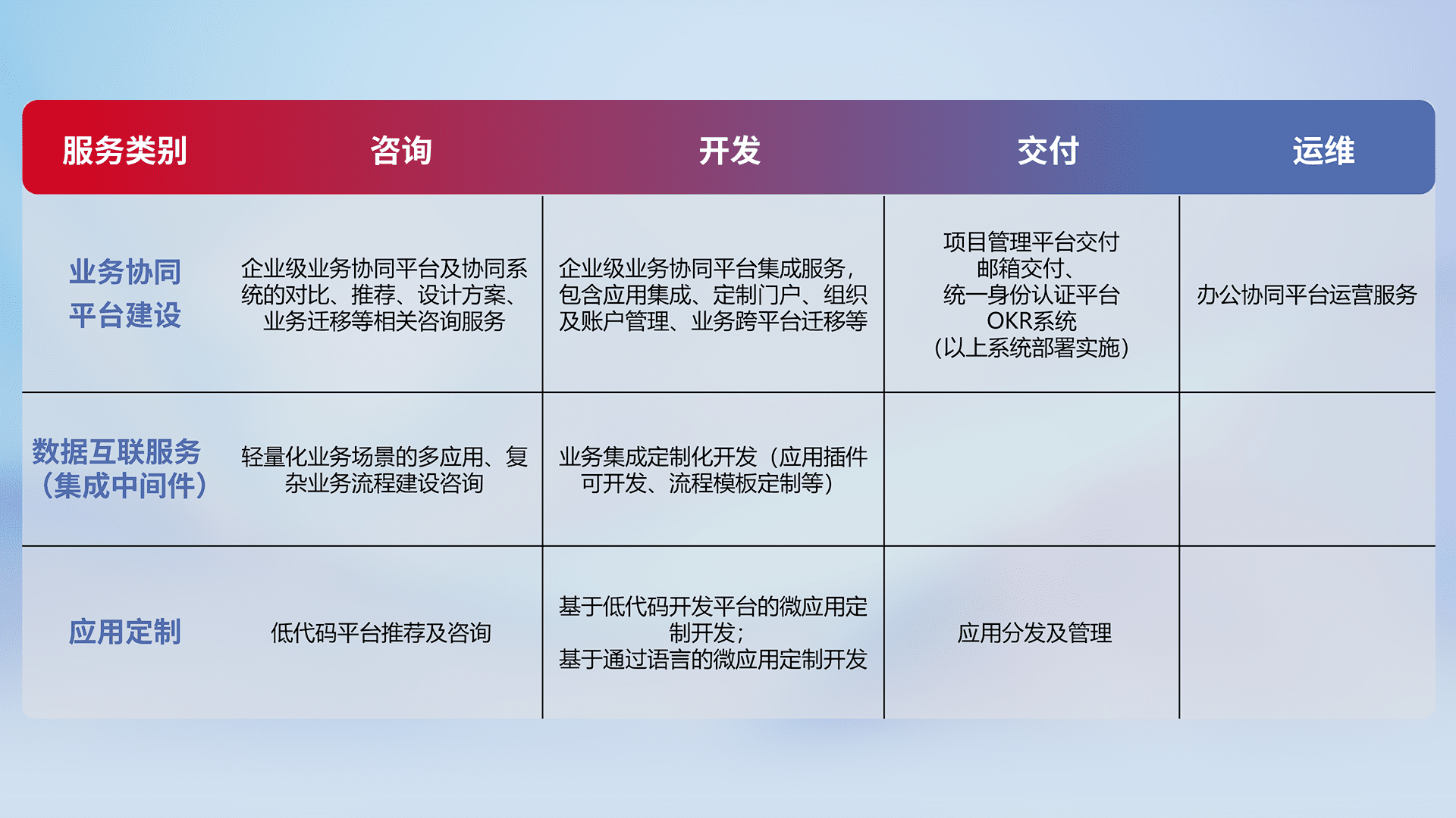 针对钉钉、、、企微、、IDaas等平台级产品提供产品的规划、、、方案、、、交付、、、、定制化开发等服务,,实现如统一协同办公、、、智能客户服务、、、、混合会议管理、、、、智能数据查询、、等业务场景,,,实现数字化转型。。。。